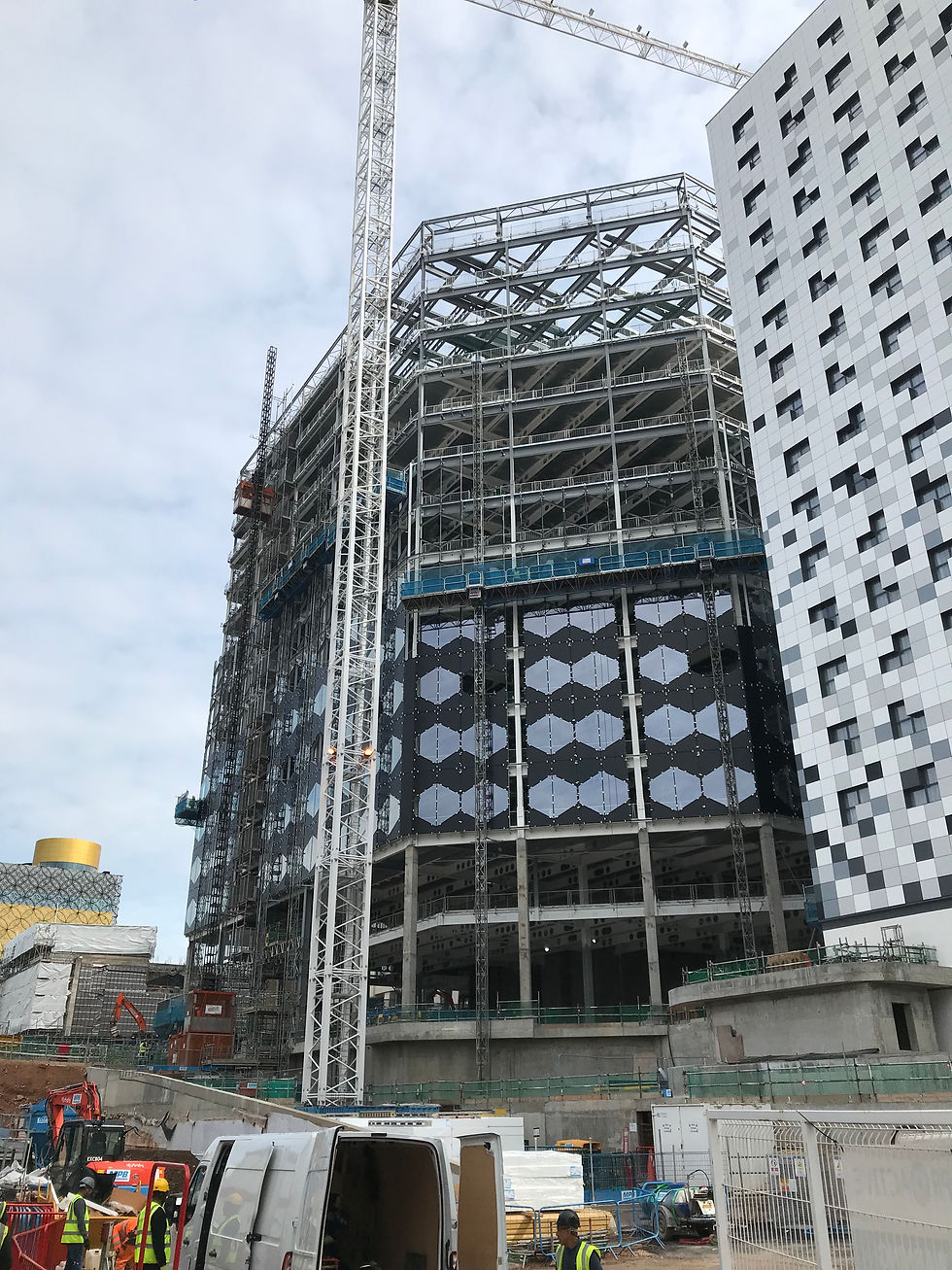 Installation of architecturally complex hexagonal curtain walling with coordinated ground-floor glazing interfaces.